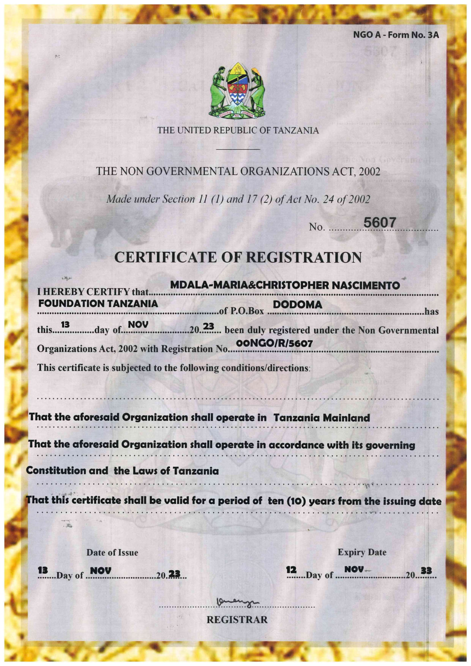 Mdala Maria & Christopher Nascimento Foundation is a legally registered nonprofit organization in Tanzania, officially recognized under registration number 00NGO/R/5607. The foundation is registered under the Non-Governmental Organizations Act, specifically Section 11(1) and Section 17(2) of Act No. 24 of 2002. The registration was officially effected on November 13, 2023.