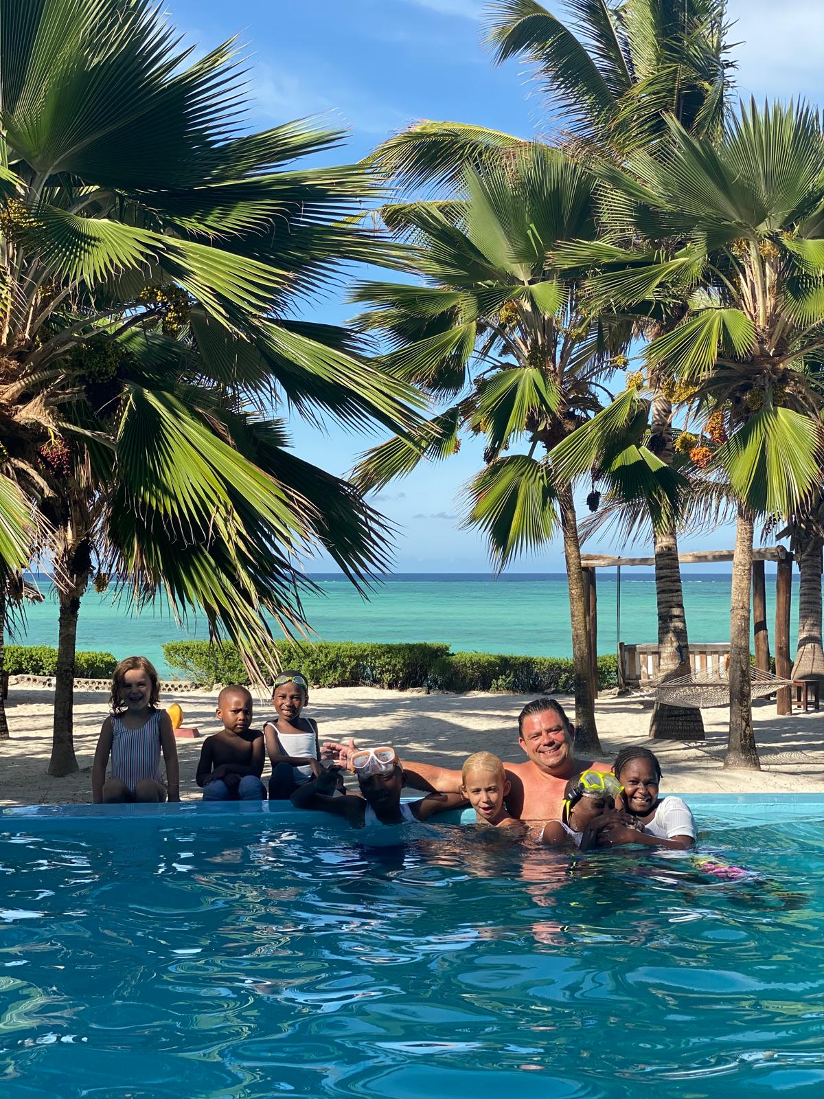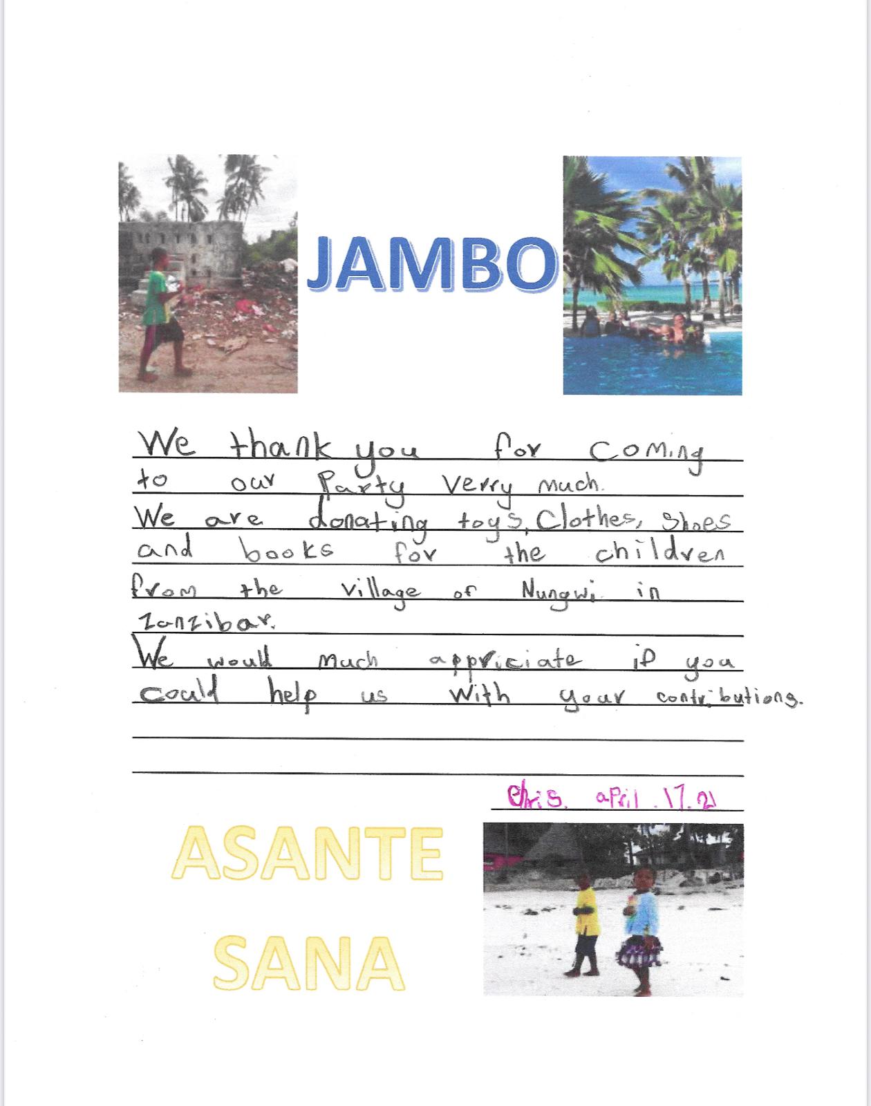 The family made friends with lots of children visiting their parents during the school vacations and Chris decided to leave his snorkeling gear and toys behind for his new friends (pool picture). Their heartwarming interaction also prompted his spontaneous promise to donate toys, shoes, and books to children in Tanzania, not just to his friends in Zanzibar. It was Chris’s 8th birthday soon after the family returned home and Chris decided to ask all his friends for donations (see the picture of the invitation below), which he and his father continue to work on.